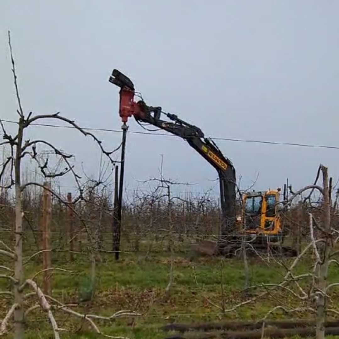 Pour la mise en place des différents éléments (poteaux, ancrages...) nous sommes dotés sur pelle d'un enfonce pieux avec pince pour la plantation des piquets bois de toutes tailles et diamètres et d'un moteur hydraulique avec mèche pour la mise en place des ancrages à visser ou à frapper.